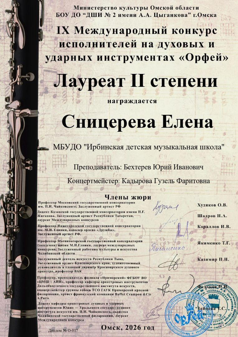 С гордостью сообщаем: Сницерева Елена, ученица Ирбинской детской музыкальной школы (отделение духовых инструментов, саксофон), стала лауреатом II степени на IX Международном конкурсе исполнителей на духовых и ударных инструментах «Орфей»! ✨