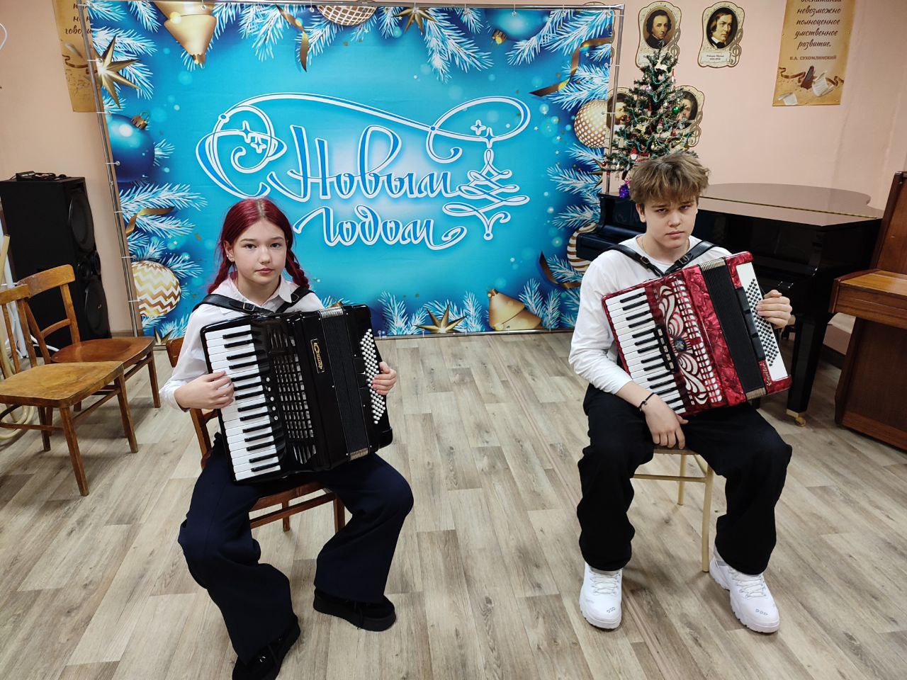 Зал был украшен новогодним декором, а нарядная елка создавала по-настоящему сказочную атмосферу. Но главным украшением, конечно, стали выступления. Юные аккордеонисты, от самых маленьких до уже опытных старшеклассников, с волнением и гордостью выходили на сцену.