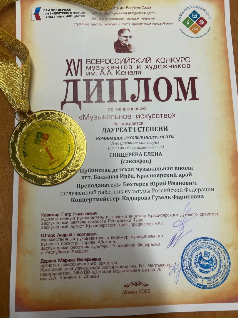 С радостью делимся результатами наших учеников на XVI Всероссийском конкурсе музыкантов и художников им. А. А. Кенеля, который прошёл 4-5 апреля 2026 года в городе Абакане.